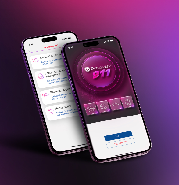 Emergencies are stressful - getting help shouldn't be. With Discovery 911, Discovery Bank clients can get roadside, home, or medical emergency assistance at the tap of a button, anytime. Find the feature under the Log in button of your banking app screen.