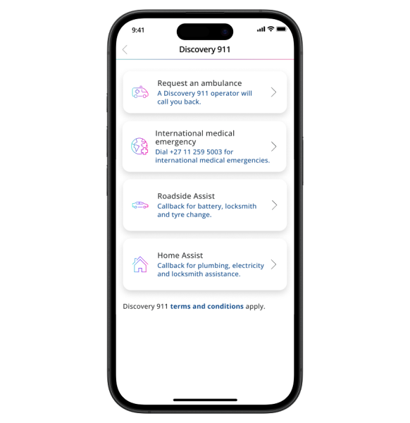 Discovery 911 is an emergency toolkit available right from your banking app. It offers fast access to a range of helpful services.