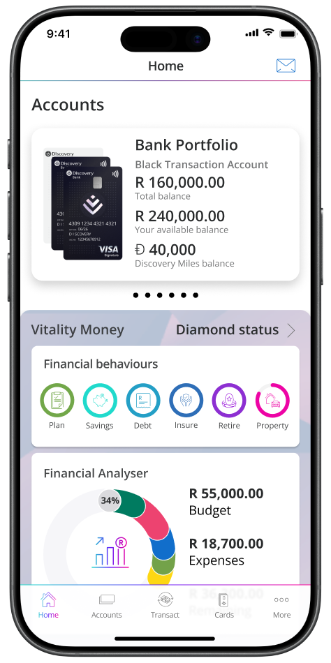 We're a bank that helps you change the way you handle your money. Only by learning more about your current financial situation can you plot a path to where you want to be financially. You can access our Vitality Money tools and calculators at any time through the Discovery Bank app to stay informed and take control of your finances.