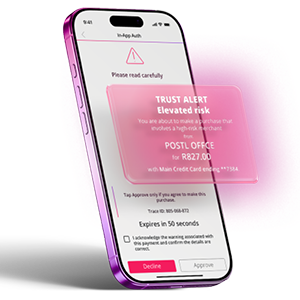 The TRUST alert is a dynamic, app-based feature that evaluates the risk of every transaction - whether it's a real-time clearance, EFT or PayShap. It uses advanced behavioural analytics to assess payments based on your unique transaction patterns.