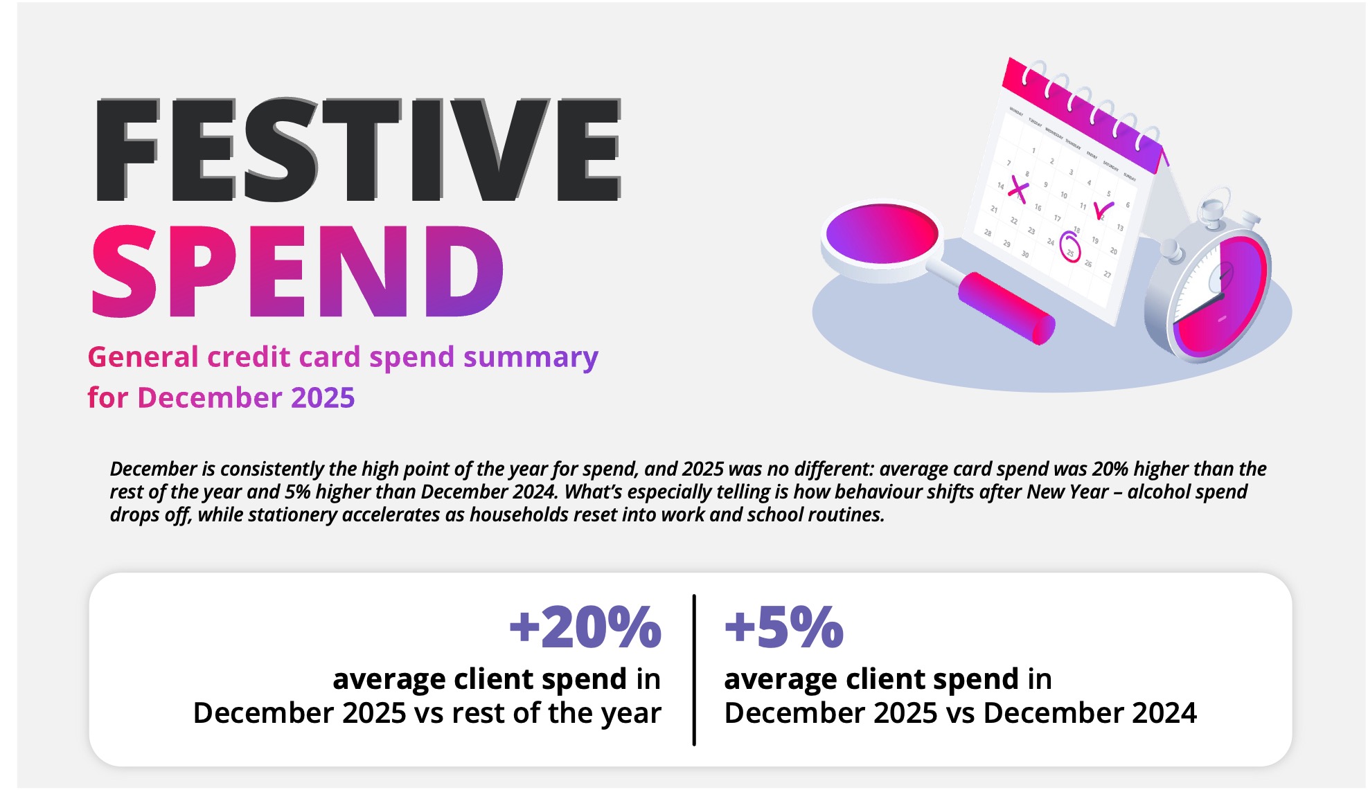 • December remains peak spending season: Average card spend was 20% higher in December against the rest of the year, and 5% higher than December 2024.