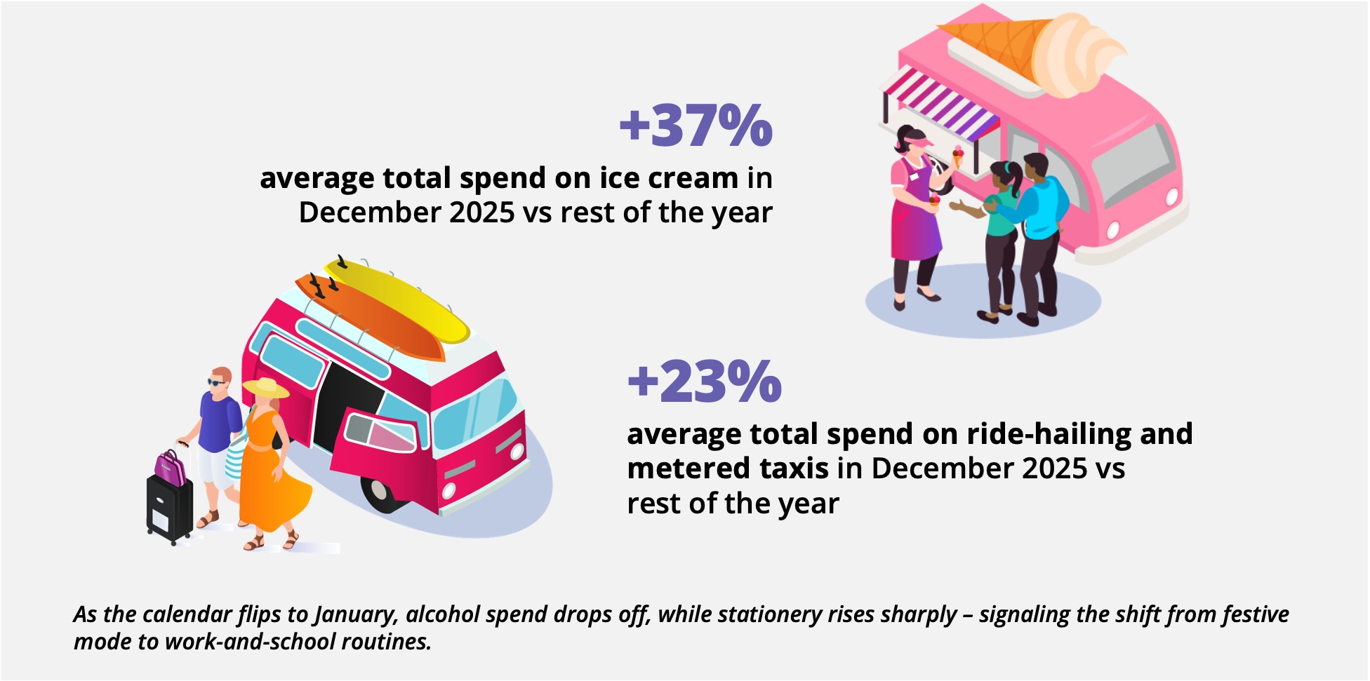 • Holiday treats, but with responsible choices: Total monthly spend at major ice cream chains was +37% higher in December compared with the rest of the year. Clients showed sensible behaviour with metered taxi and ride-hailing spend +23% higher in December compared with the rest of the year.