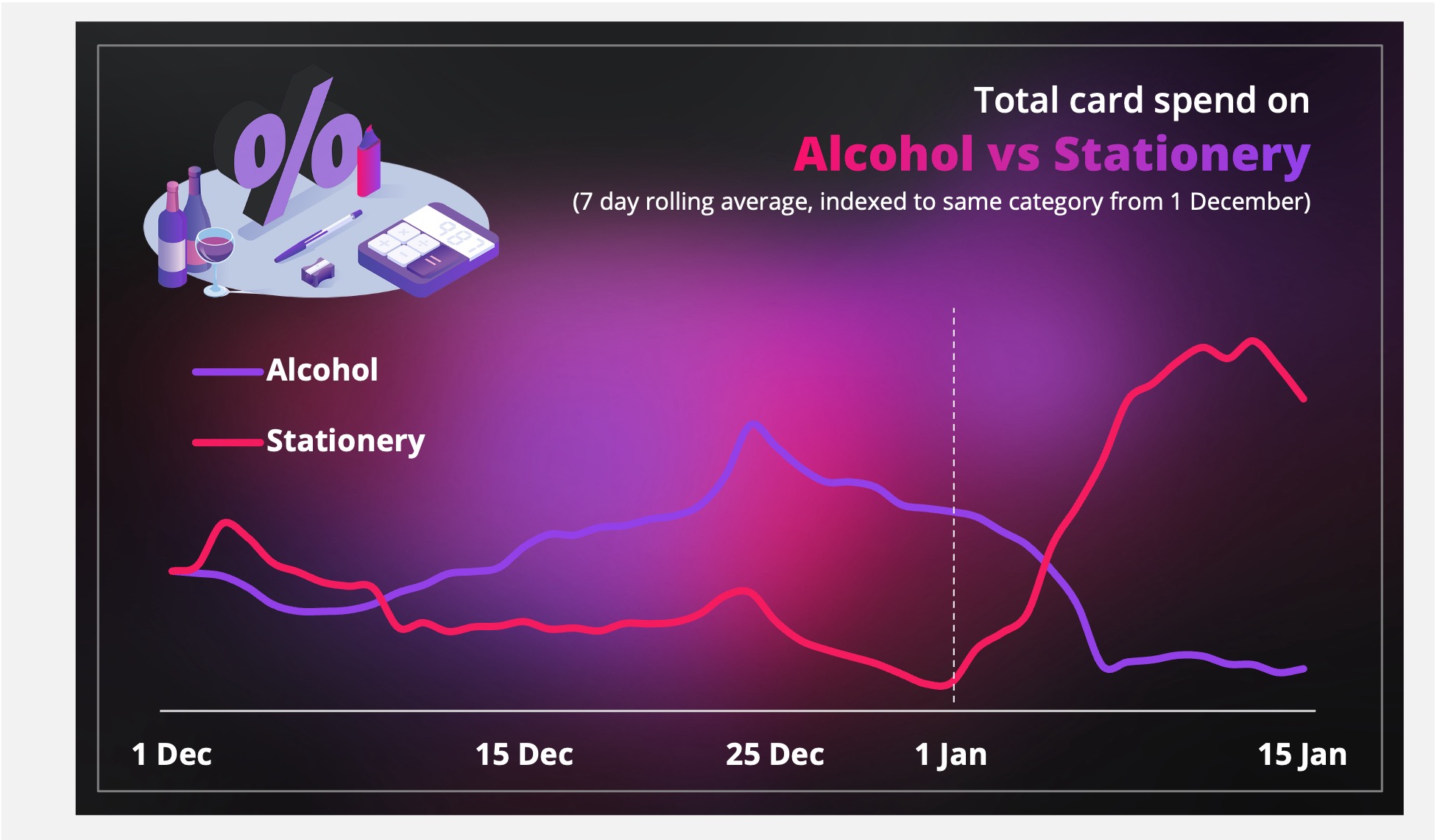 • From festive season to 'back-to-life' mode: As the calendar flips to January, alcohol spend eases off and stationery spend rises sharply, reflecting New Year resolutions, work resets, and school prep coming through strongly in post-festive shopping behaviour.