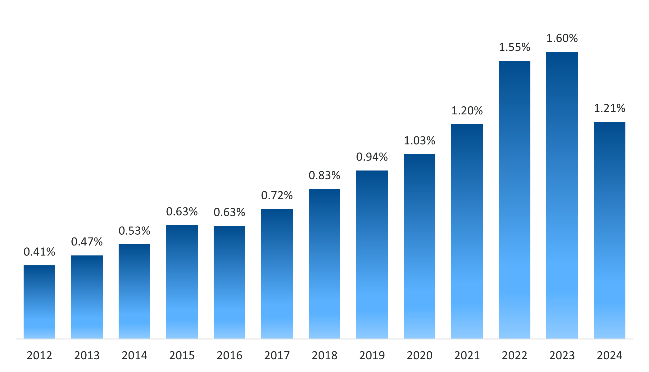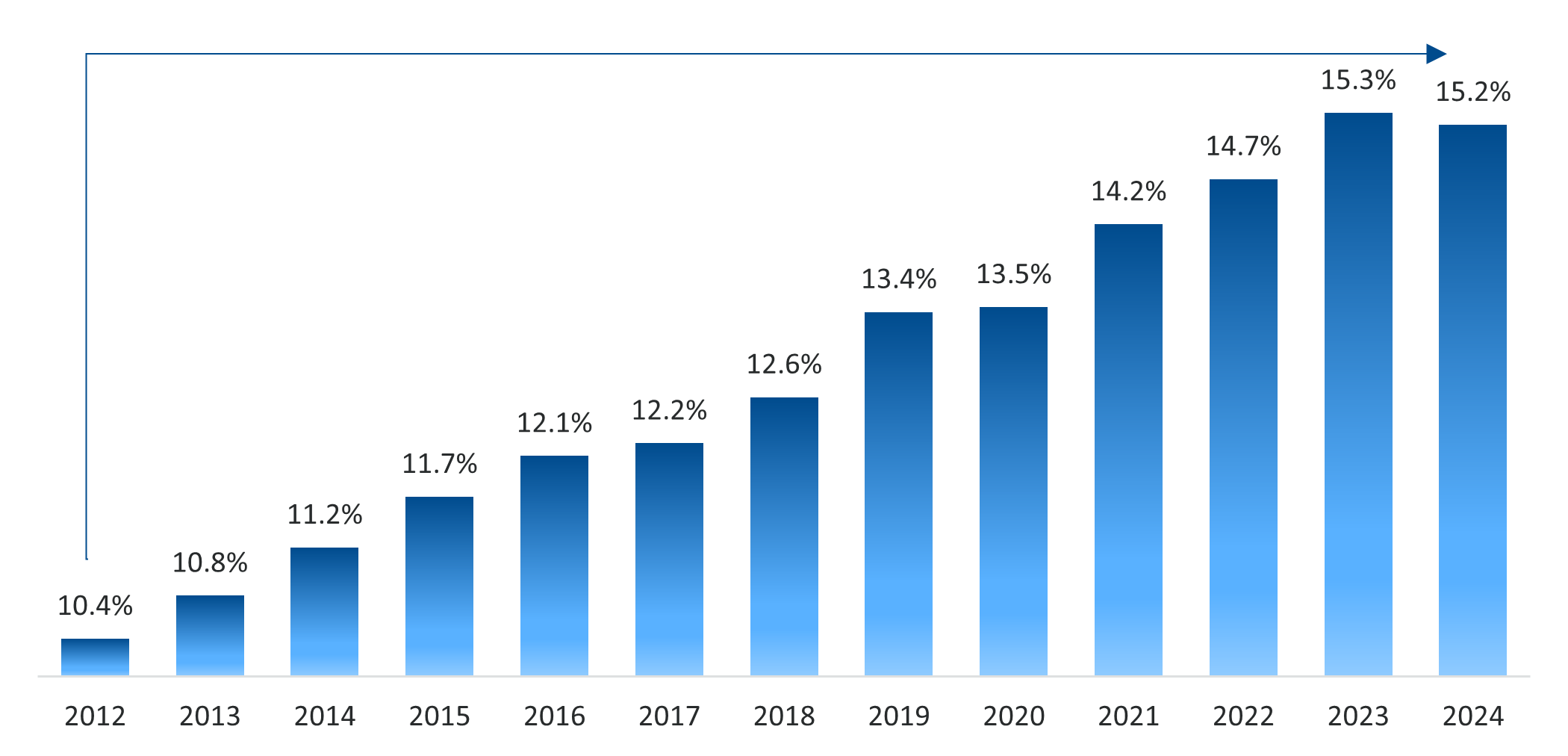 The prevalence of mental health conditions is on the rise in the Discovery Health Medical Scheme.6 Figure 2 shows the proportion of DHMS members registered or claiming for a mental health condition each year compared to 2012. In 2024, approximately one in seven scheme members (15.2%) had a mental health condition compared to only one in ten (10.4%) in 2012. This means that over the past 13 years , the prevalence of these mental health conditions has increased by 46% (Figure 2), which is equivalent to a growth rate of 4.4% each year.