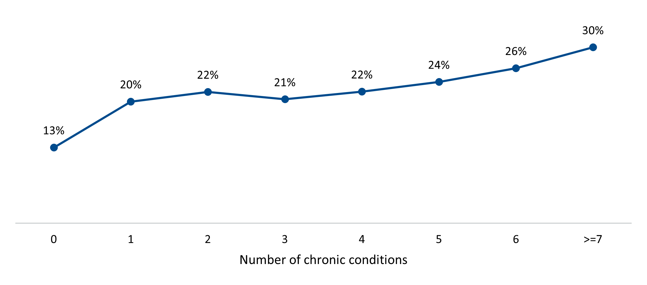Figure 8: Proportion of DHMS members registered or claiming for mental health conditions by number of chronicin (excluding schizophrenia and bipolar mood disorder)
