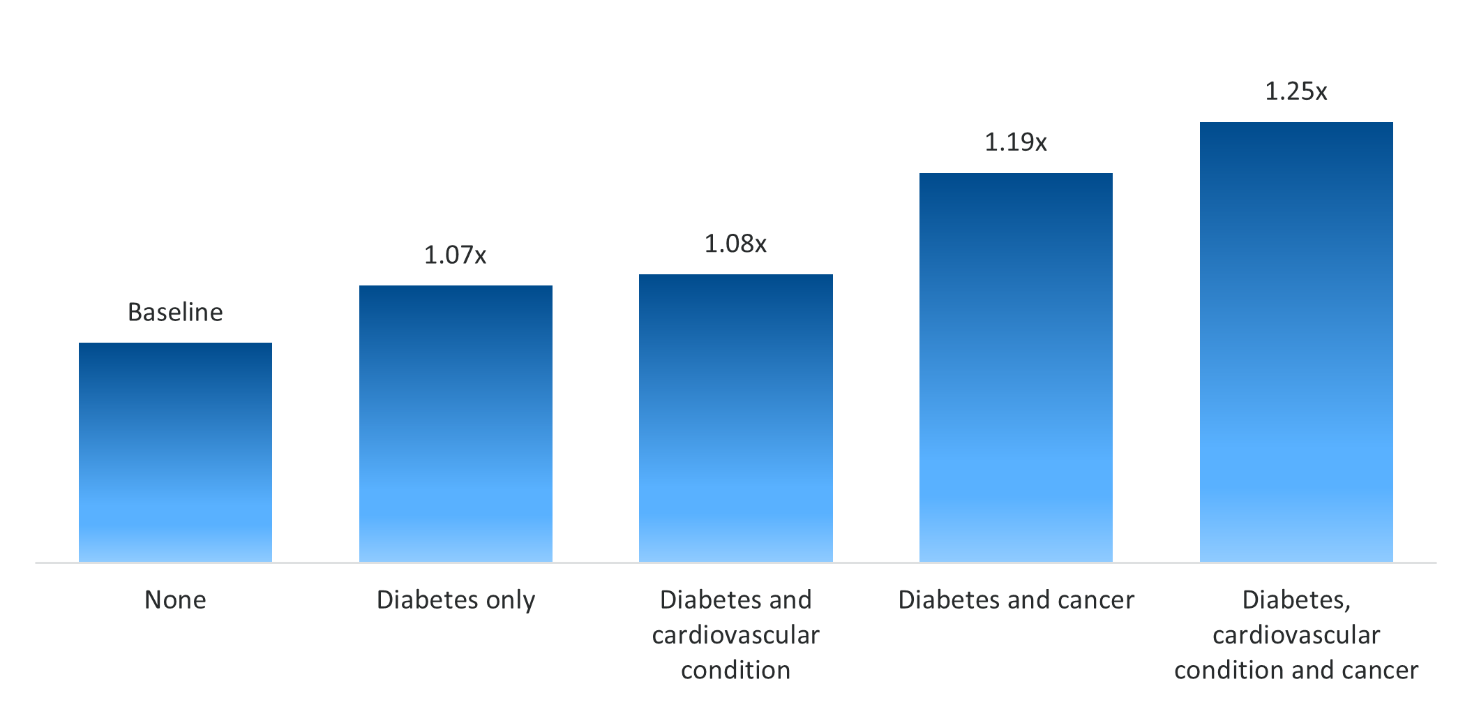 When looking at diabetes, cancer and cardiovascular disease in particular, Figure 9 shows that members with all three of these conditions have a 25% higher mental health condition prevalence than members with none of the three conditions, after adjusting for relevant risk factors. Members with all three conditions also have a 17% higher prevalence of mental health conditions than members with diabetes only (1.25x vs 1.07x relative prevalence). This highlights the increased burden of mental health conditions amongst complex, chronic populations.