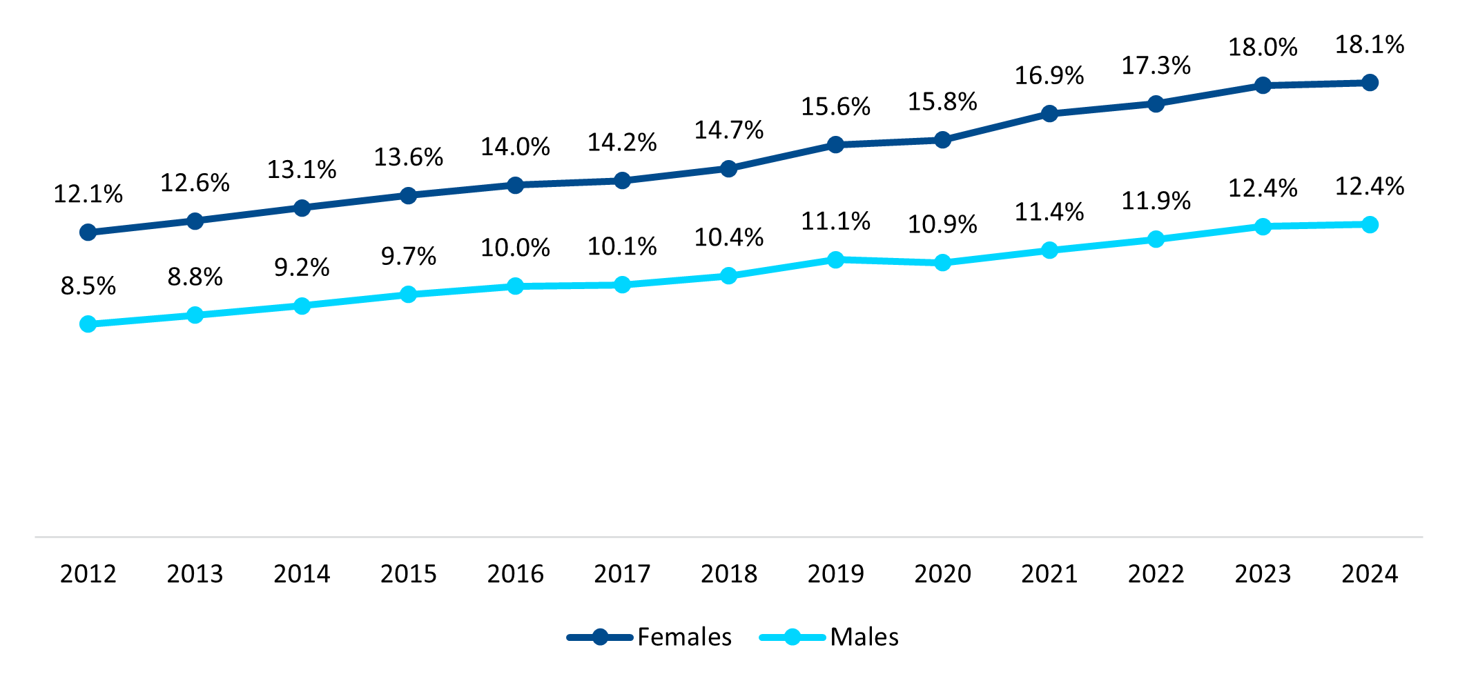 There is a clear disparity in the burden of mental health conditions between female and male members in the Discovery Health Medical Scheme (DHMS), with 62% of the population with mental health conditions in 2024 being female. Our registration and claims data show that mental health conditions were 45% more prevalent in females than in males (18.1% for females vs 12.4% for males in 2024, Figure 1). The prevalence of mental health conditions has increased slightly faster among females at 49% from 2012 to 2024, compared to a 47% prevalence increase in males. This gap has stayed consistent over time and aligns with international literature, which shows females are more likely to be diagnosed with a mental health condition or seek mental health care.1