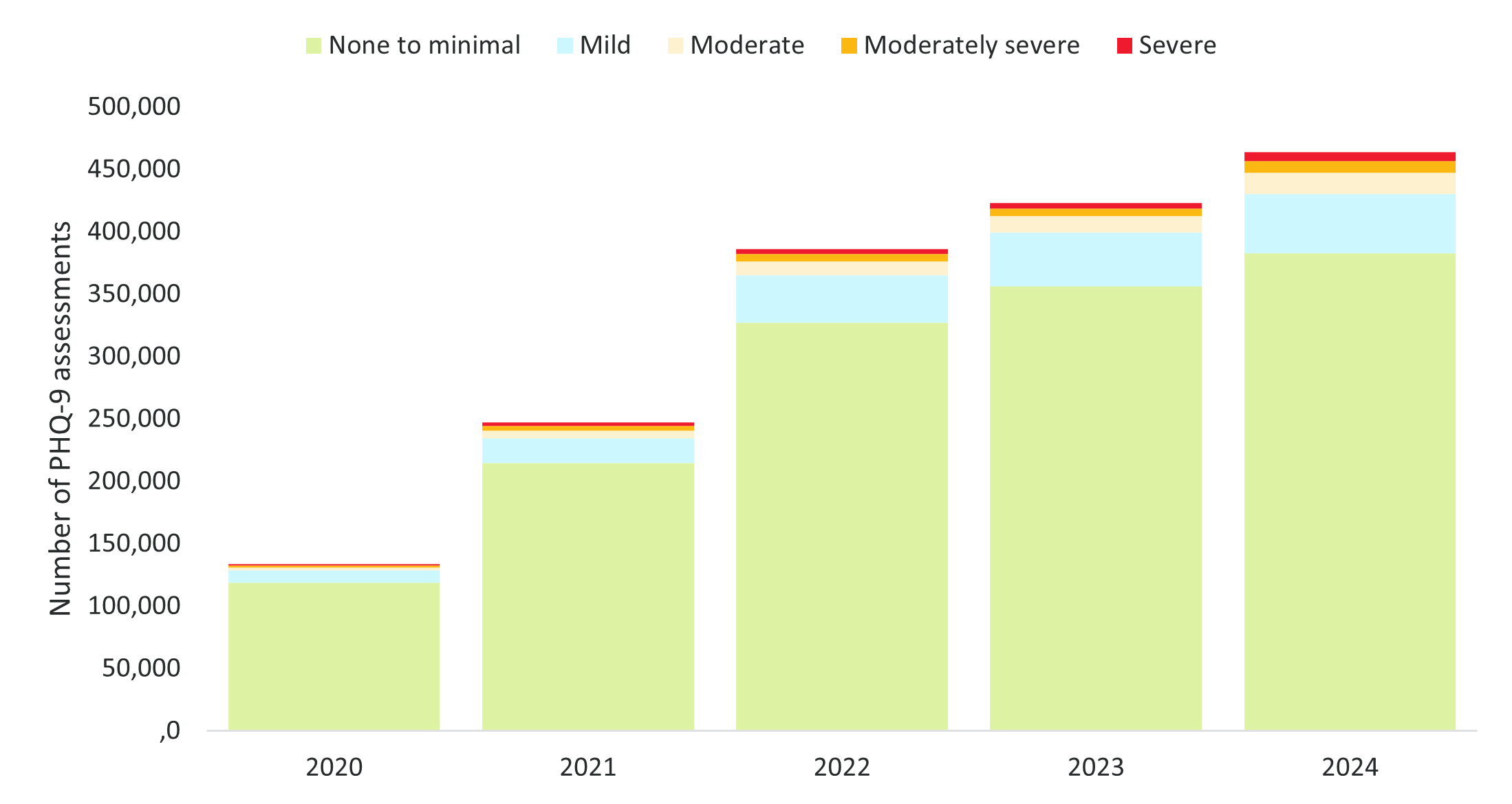 Since data collection began in 2020, the number of Scheme members who complete a PHQ‑9 assessment has grown each year. In 2024, 351,000 members completed 463,000 PHQ‑9 assessments, compared to the 118,000 members who completed 133,000 PHQ‑9 assessments in 2020 (Figure 1).