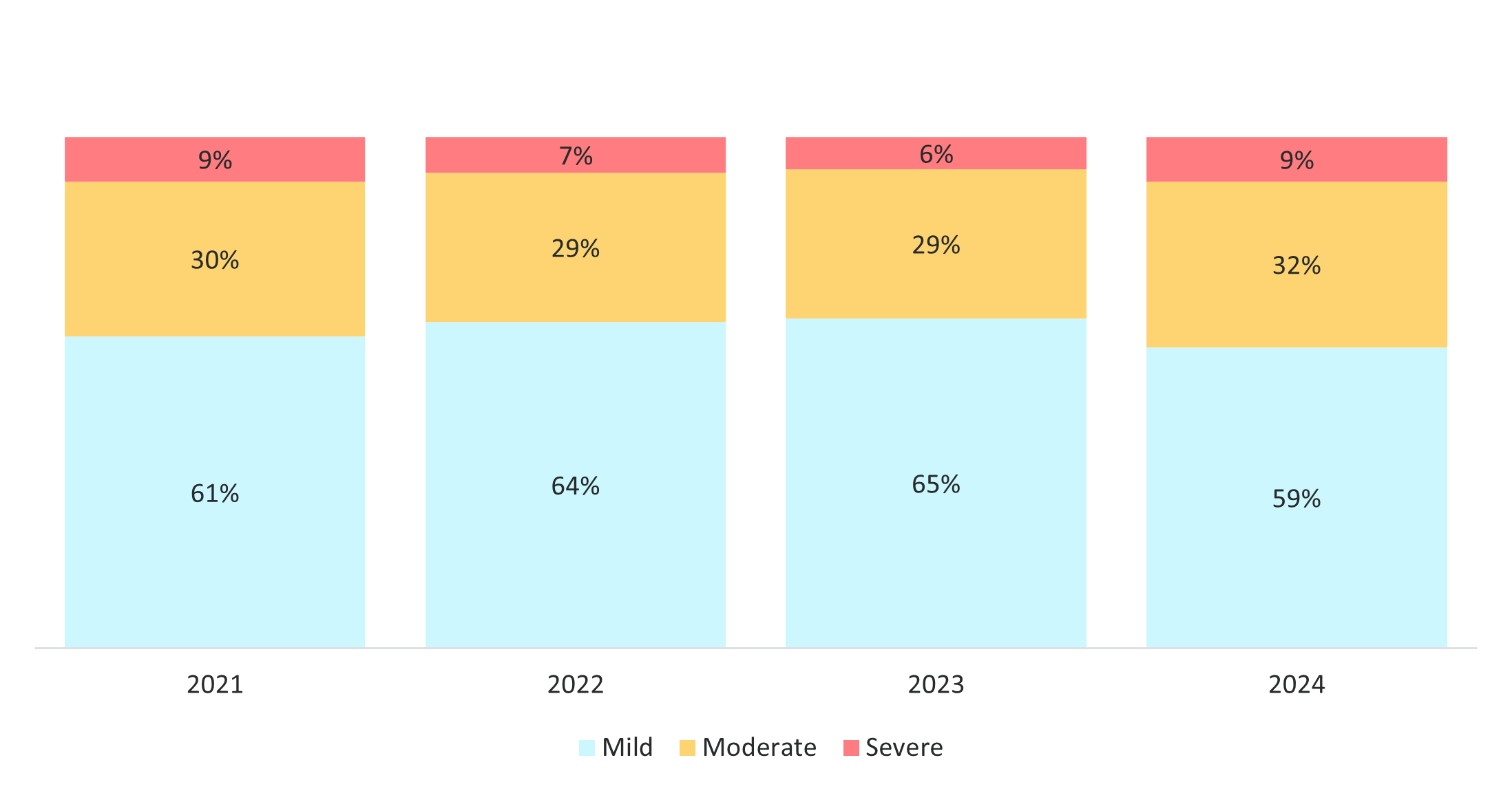 Figure 2 shows completed PHQ‑9 assessments with depression symptoms ranging from mild to severe between 2020 and 2024. The proportion of PHQ‑9 assessments showing moderate to severe symptoms (a PHQ‑9 score between 10 and 27) increased from 39% in 2020 to 41% in 2024. Conversely, the proportion of assessments showing mild symptoms (a PHQ‑9 score between 5 and 9) reduced from 61% in 2020 to 59% in 2024. This trend shows an increasing proportion of DHMS members with more severe depression symptoms.