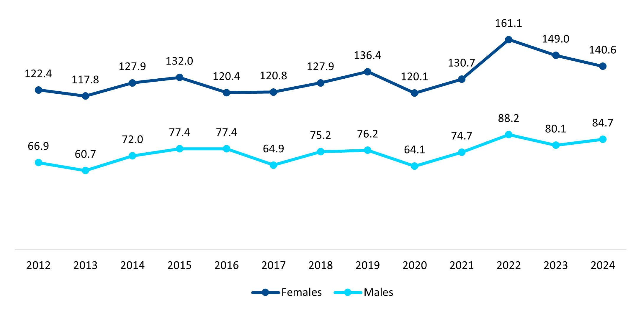 The data suggests that suicide or self‑harm claiming rates were 66% higher among female members than male members (140.6 for females vs 84.7 for males in 2024, as shown in Figure 5). This trend has been consistent over time and also aligns with international surveys which show that females have higher rates of suicidal behaviour or attempts.