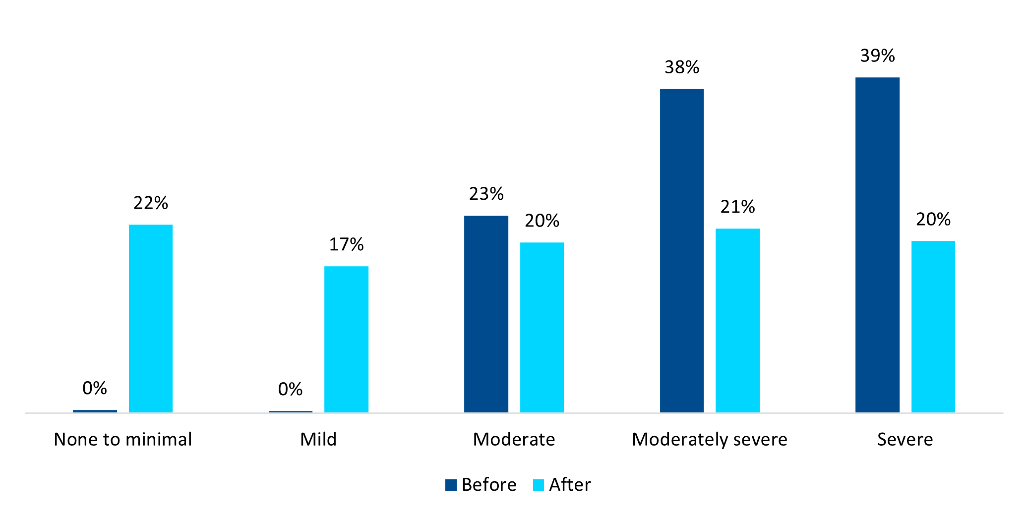 The members' PHQ‑9 scores have been analysed. Their scores were recorded either on the day they joined the programme or in the six months beforehand. These scores were then compared to their scores after they completed the programme. It was found that 62% improved their PHQ‑9 score, 26% remained in the same band and 13% moved to a band with more severe symptoms. Of those who completed two PHQ‑9 tests, before and after they joined, the proportion of members in the 'None to minimal' and 'Mild' bands increased, whereas the proportion of members with moderate to severe depression decreased (Figure 7). This shows that the severity of depression symptoms reduced after members completed the Mental Health Care Programme.