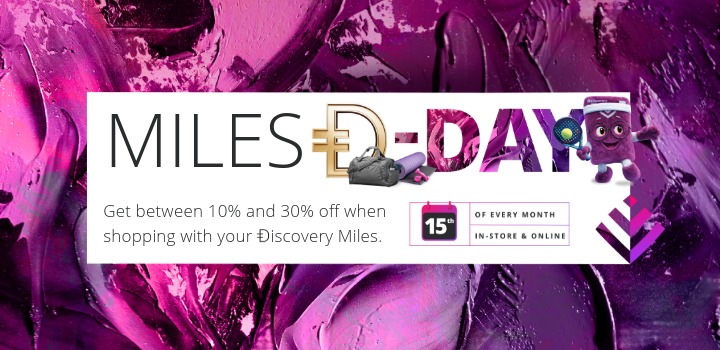 Plus, Discovery Bank will double your discount on the 15th of every month when you spend your Ðiscovery Miles at our retail partners.